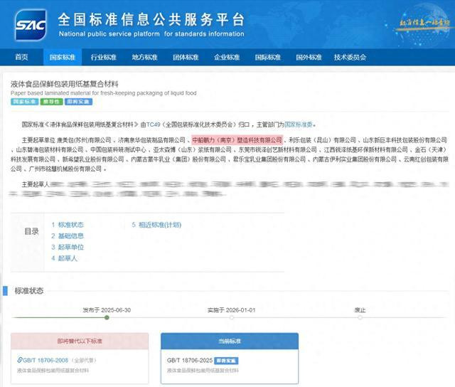 近日,由全国包装标准化技术委员会提出并归口,鹏力塑造等十多家单位主导制定的国家标准《液体食品保鲜包装用纸基复合材料》(GB/T18706-2025)正式获批发布,该标准将于2026年1月1日起全面实施。
